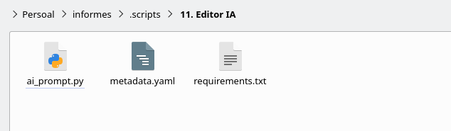 Si abrimos el subdirectorio .scripts y, a continuación, la carpeta 11. Editor IA, facilitaremos a la inteligencia artificial el archivo ai_prompt.py.