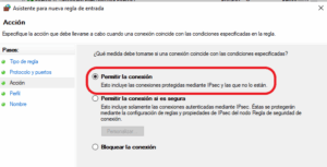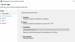 b. En la ventana del Firewall en el panel izquierdo, haz clic en Reglas de entrada. Seguidamente en el panel derecho selecciona Nueva regla. Elige puerto y presiona en siguiente.