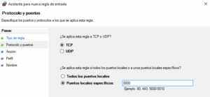 Seleccionas TCP y escribe 8000 en el campo Puertos locales específicos
