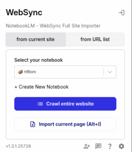 Una vez creado el cuaderno, haz clic en la extensión WebSync – Full Site Importer y selecciona el cuaderno HRom