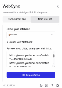 Ahora procedes a insertar estas url en Notebooklm. No obstante, para no tener que insertar una a una, podemos valernos de la siguiente extensión para Google Chrome: WebSync – Full Site Importer. Instala por tanto la extensión.