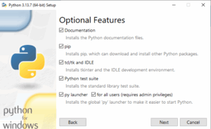 Y en la siguiente pantalla, seleccionas «Install 3.13 for all users» y «Download debugging symbols», manteniendo seleccionadas las 4 marcadas por defecto. Finalmente, presiona en «Install»